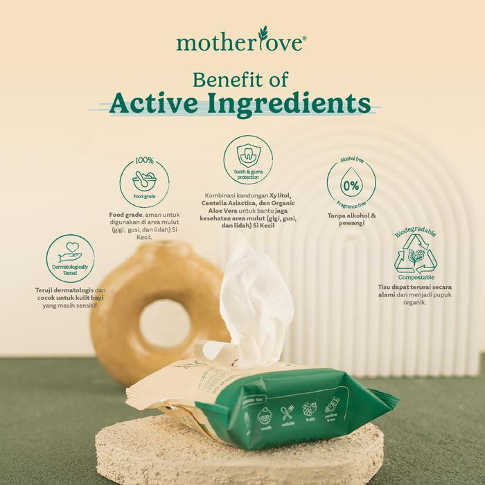 Tisu basah dengan yang Babyproof Natural Actives yang berfungsi untuk membersihkan dan menjaga kesehatan area mulut (lidah, gusi, dan gigi).
