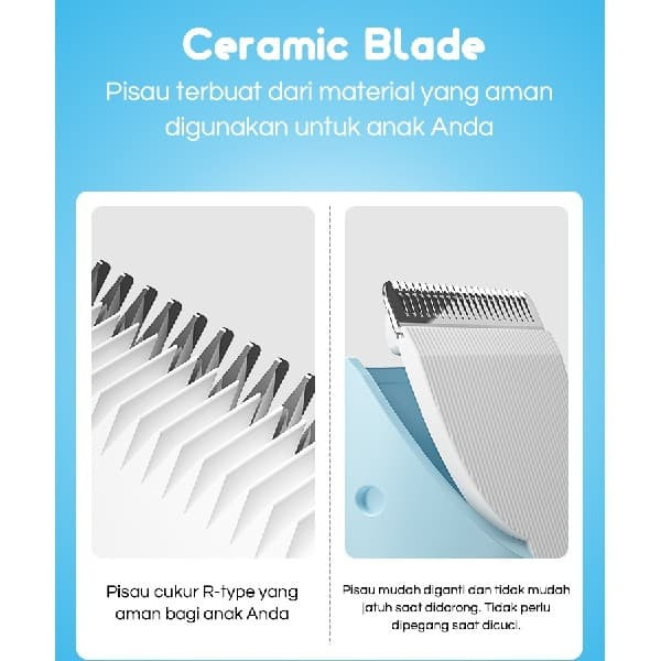 - Safety Blade Protection: Kepala Ceramic Blade aman; tidak melukai kepala anak