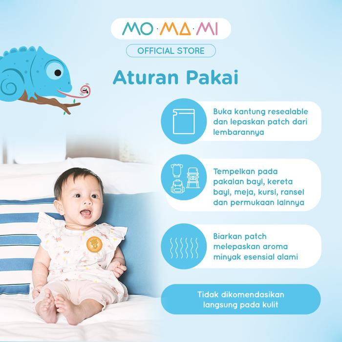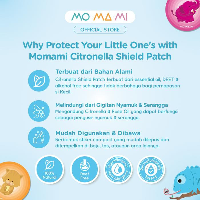 MO.MA.MI Citronella Shield Patch adalah stiker anti nyamuk yang aman digunakan untuk bayi dan anak-anak. Menggunakan bahan-bahan alami untuk menghindarkan dari nyamuk seperti Citronella dan Rose Oil. Tidak menggunakan DEET atau harsh chemicals yang berbahaya. Mudah ditempel dan dilepaskan, tidak meninggalkan bekas lem pada permukaan yang tertempel. On the go, mudah dibawa kemana saja. Dapat ditempel pada: baju, stroller, meja, kursi, tas dan baby crib. Wangi dapat tahan selama 6 jam.