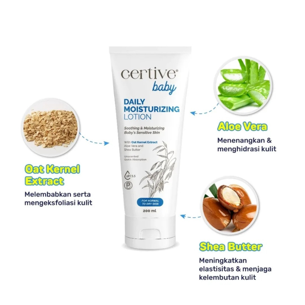 Certive Baby Daily Moisturizing Lotion aman digunakan untuk anak dengan kulit sensitif maupun eksim. Diformulasikan dengan kombinasi Ekstrak Kulit Gandum (Oat Kernel Extract), Aloe Vera, dan Shea Butter untuk memberikan perlindungan ekstra pada kulit bayi. Formula nya efektif menghaluskan kulit dan menyerap di kulit dengan cepat tanpa meninggalkan bekas berminyak sehingga aman untuk kulit bayi yang baru lahir sekalipun.