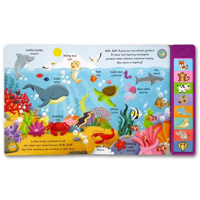 Di tiap scene ada cerita pendek nya (dalam Bahasa Indonesia) dan ada lebih dari 50 nama-nama hewan dalam 2 bahasa: Bahasa Indonesia & Bahasa Inggris.