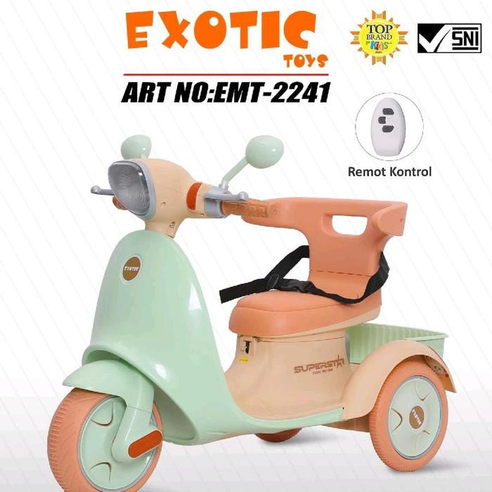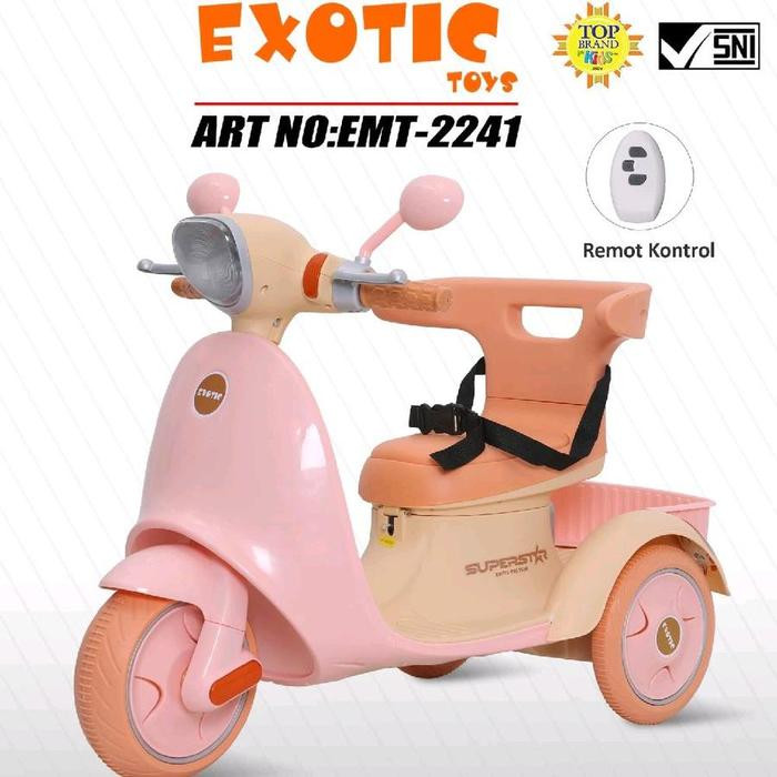 Berikan si kecil pengalaman seru berkendara dengan Mainan Motor Aki Exotic EMT-2241! Didesain menyerupai motor sungguhan dengan fitur-fitur lengkap dan keamanan terjamin, motor ini cocok untuk anak usia 2–6 tahun.