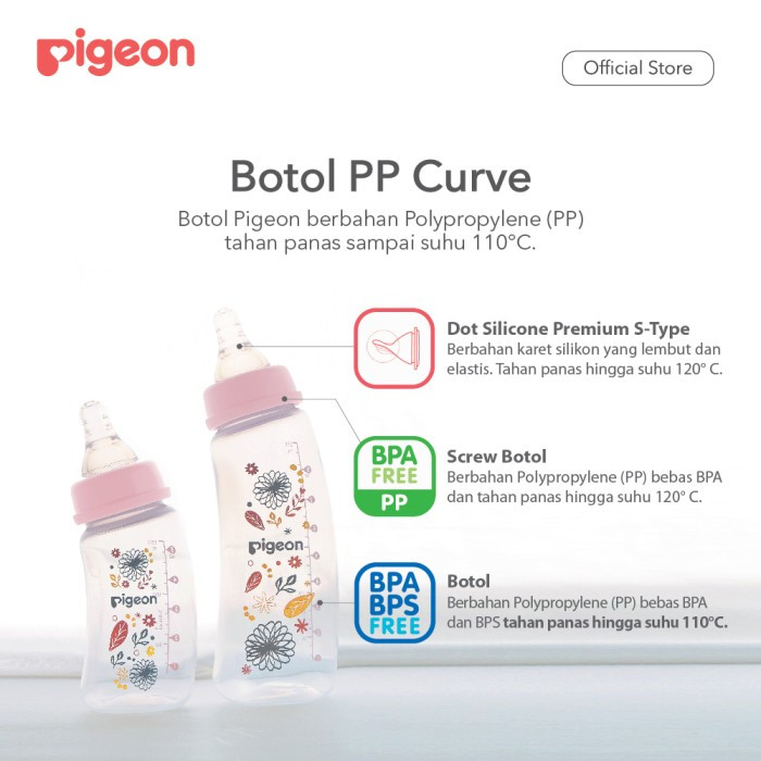 karakter bunga warna pink yang terbuat dari Tinta Food Contact Grade sehingga sesuai digunakan untuk wadah pangan untuk bayi. Botol PP Curve ukuran 250ml dilengkapi dengan dot Peristaltic Slim Neck ukuran M untuk bayi baru lahir (+4 bulan) dan dilengkapi dgn buku instruksi yang dikemas dalam Individual Box berbahan Carton Ivory.