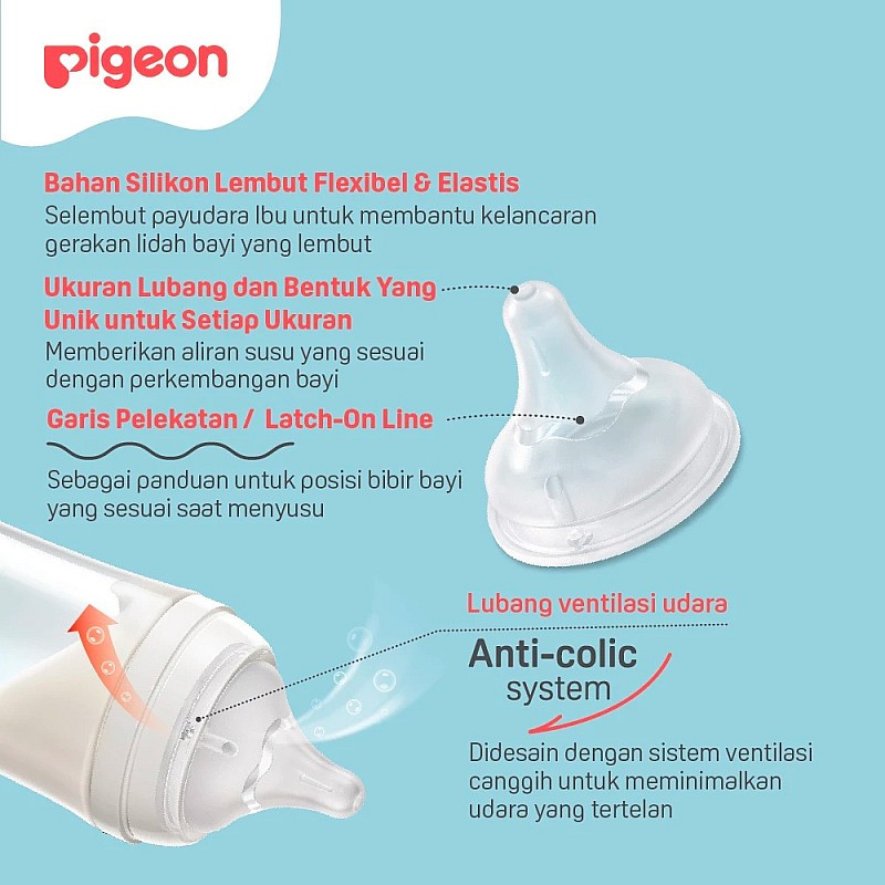 Dilengkapi dengan SofTouch NIpple dengan garis latch-on line sebagai panduan untuk posisi bibir bayi yang sesuai pada saat menyusu dan dengan bahan silikon yang lembut seperti marshmallow.