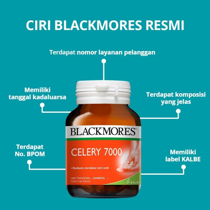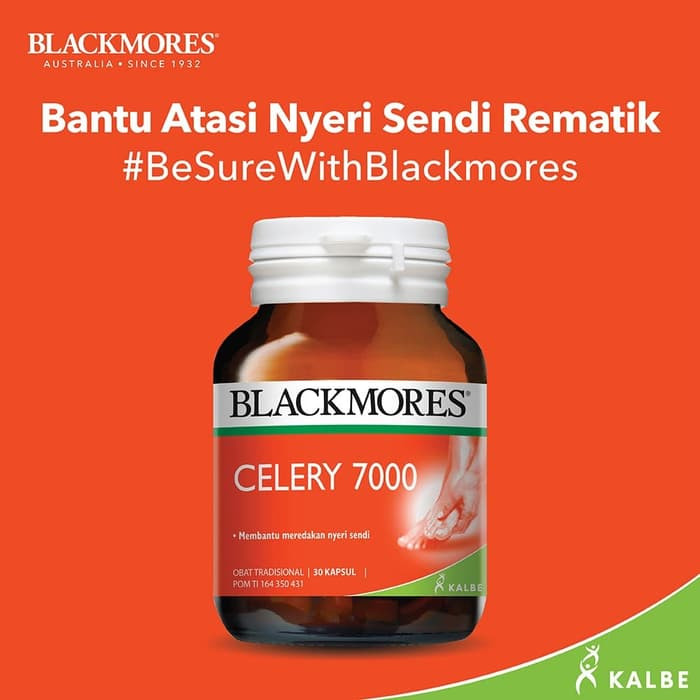 Blackmores Celery 7000 (30) merupakan suplemen kesehatan sendi berupa obat herbal tradisional dengan minyak biji seledri untuk meredakan rasa sakit sementara pada radang sendi (arthritis), rematik dan asam urat (gout).
