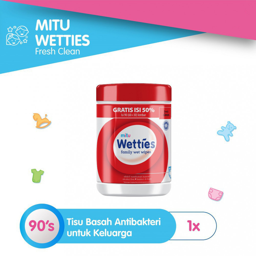 Mitu Wetties Antibacterial merupakan tisu basah keluarga yang terbukti 99% dapat membunuh kuman, sehingga dapat menggantikan fungsi sabun dan air.