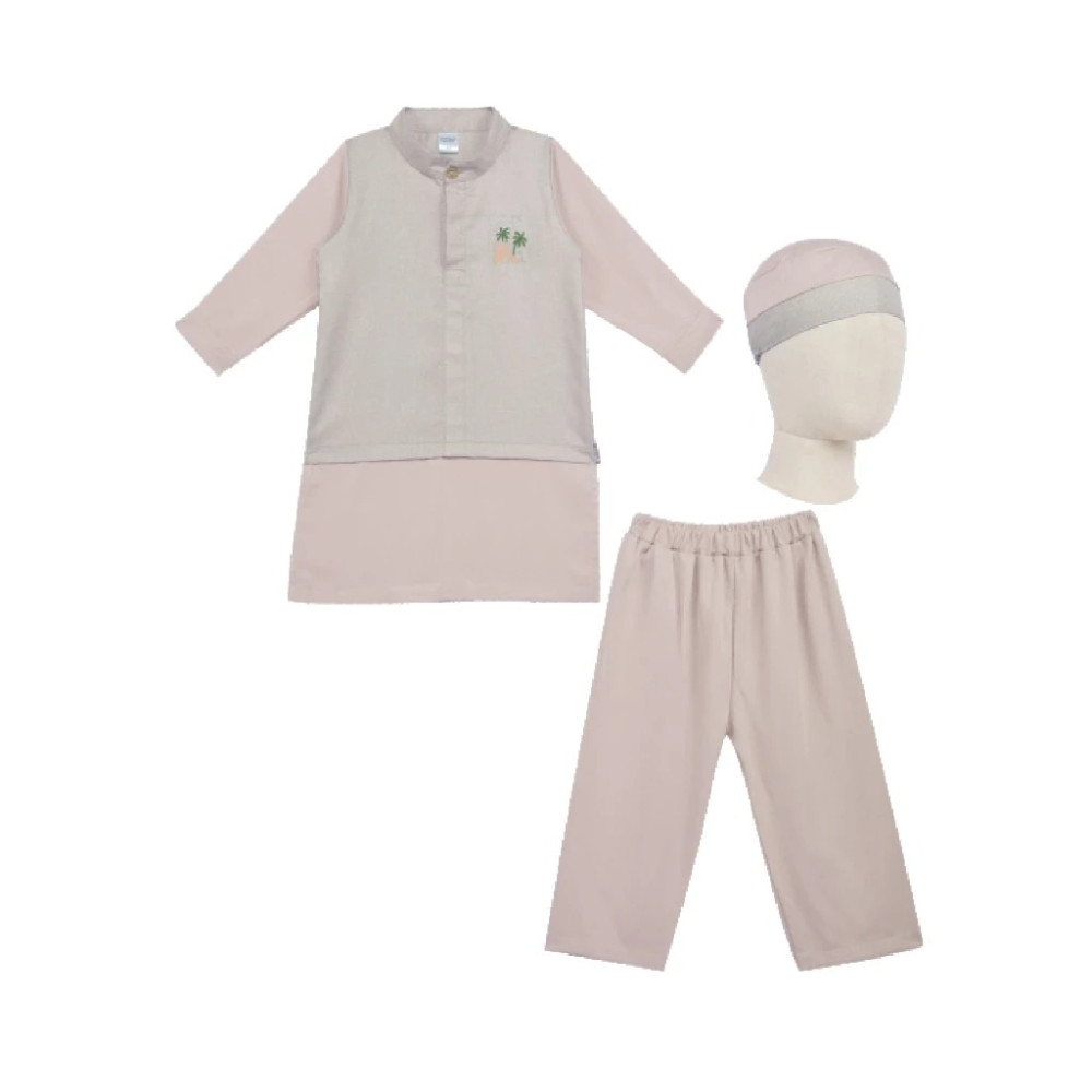 – Desain berupa koko dengan aksen rompi bermotif serta tambahan peci untuk melengkapi outfit ramadhan buah hati.