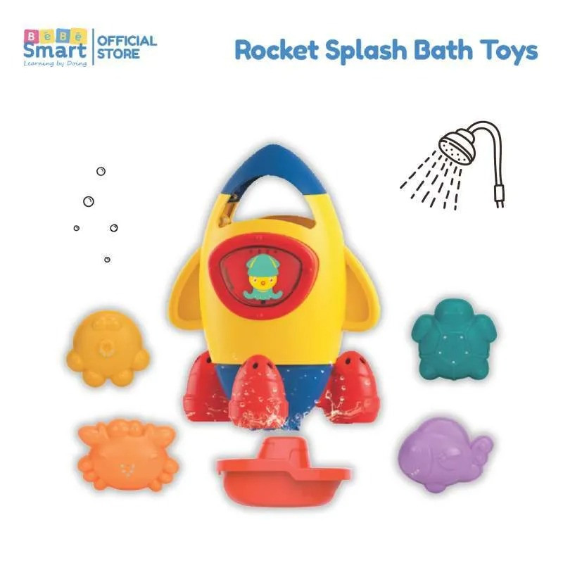 Mainan mandi ini terdiri dari Rocket yang unik banget lho moms, Cara mainnya sangat gampang tinggal celupin roketnya ke dalam air hingga penuh, kemudian angkat roketnya, maka airnya akan menyembur layaknya roket saat diterbangkan. Saat diangkat bagian bawa roketnya juga akan memutar.