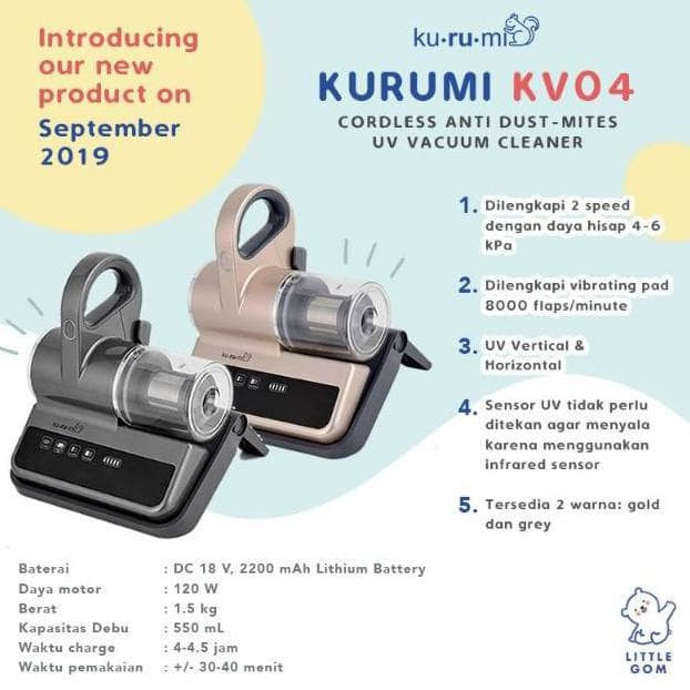 Deskripsi Kurumi KV 04 Cordless Anti Dust-Mites UV Vacuum Cleaner Gold & Grey