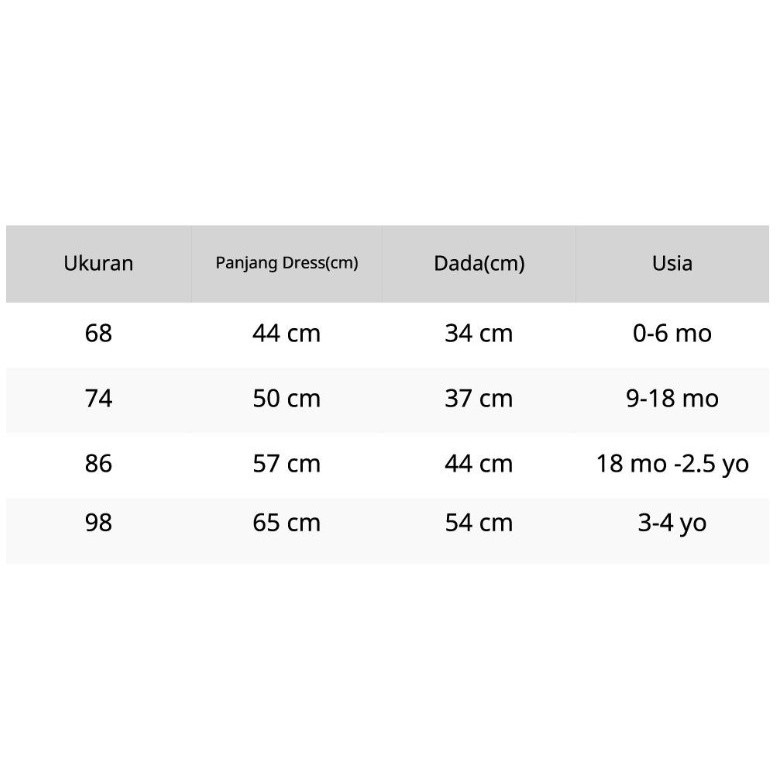 - Sz 86 : LD 37 cm, Panjang Baju 65 cm (18 - 2.5y)