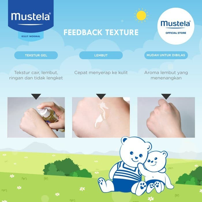 Semprotkan mustela massage oil pada telapak tangan lalu pijatkan ke tubuh bayi secara perlahan