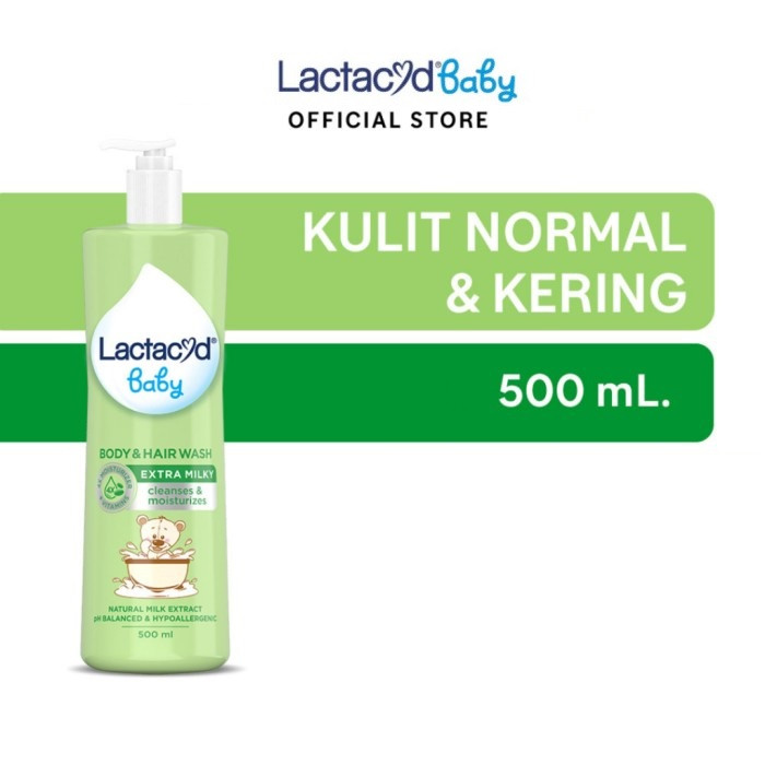 Lactacyd Baby Extra Milky 2in1 Body Wash and Hair Shampoo mengandung Lactic Acid dan Lactoserum dengan pH yang sesuai dengan kondisi alami kulit bayi dan melembutkannya