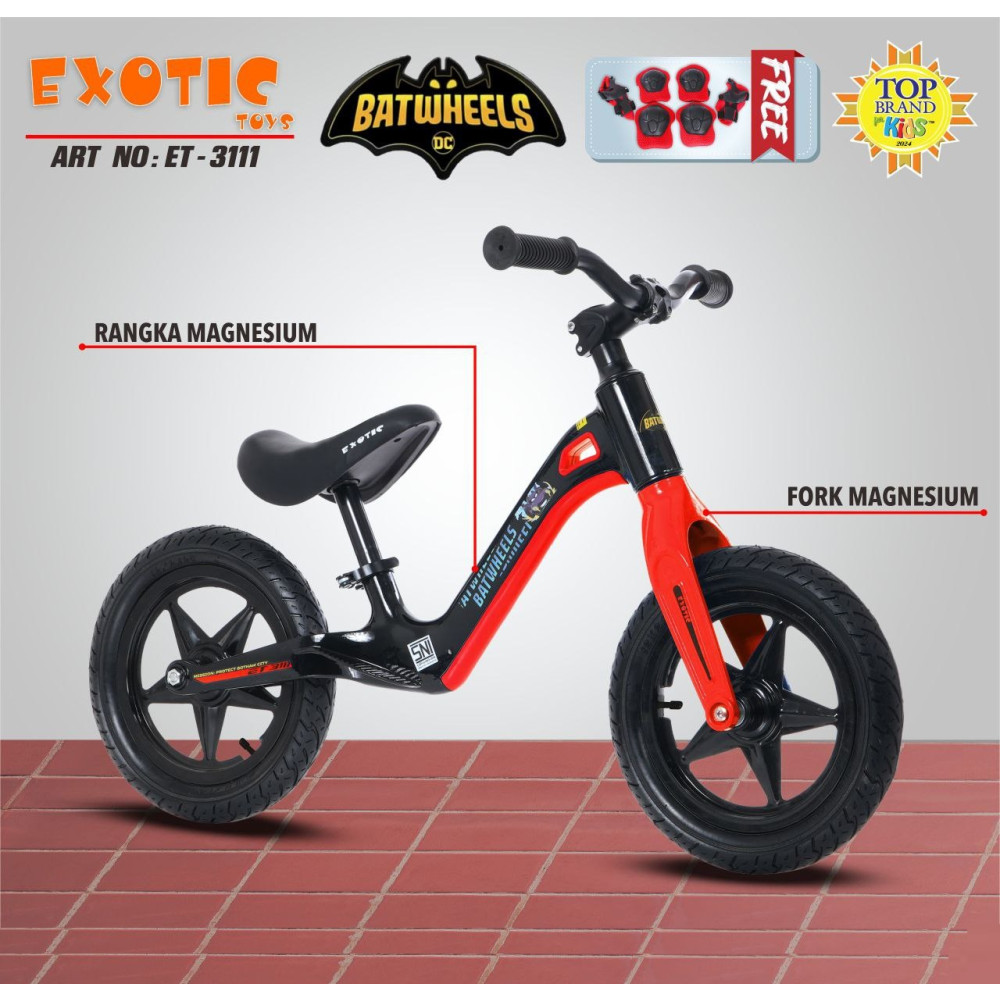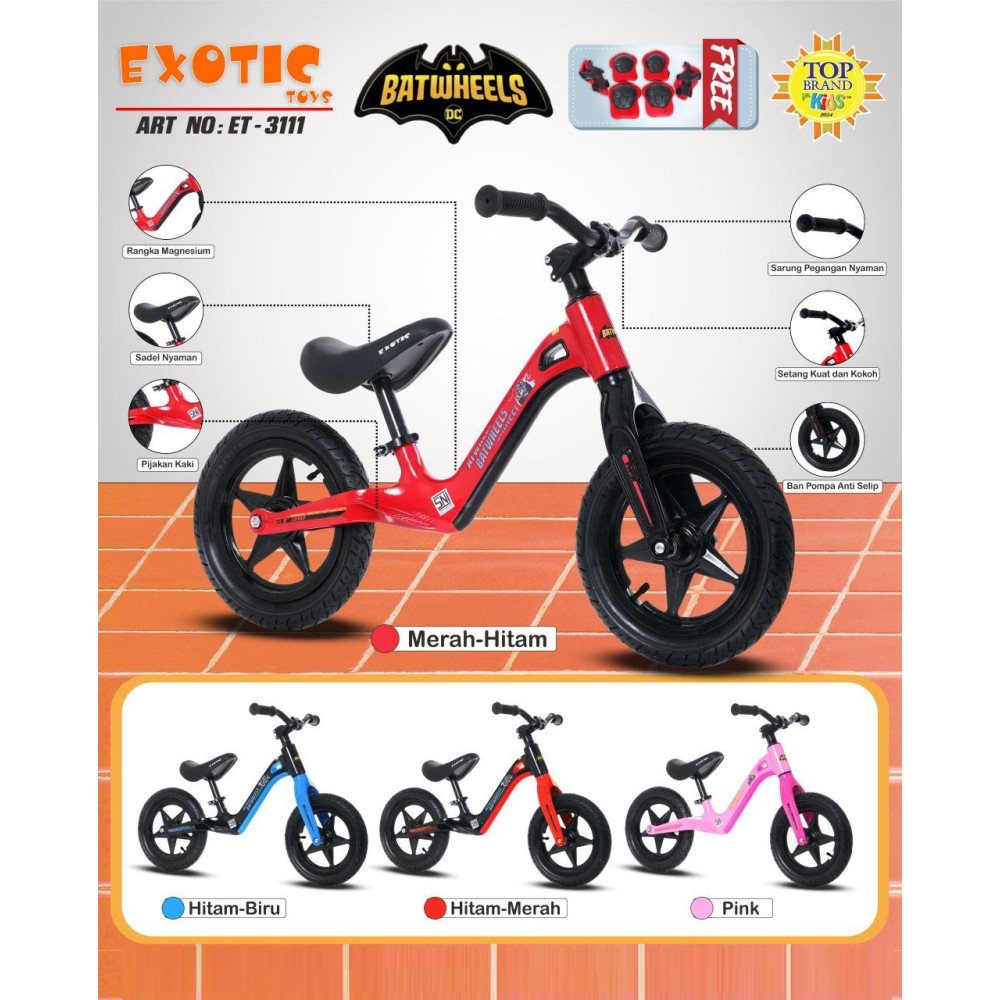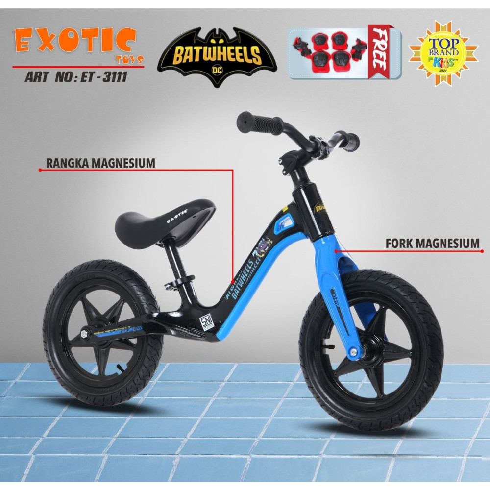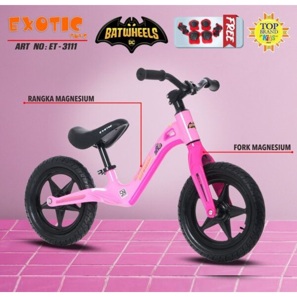 Sepeda unik, tanpa gir dan pedal, untuk melatih keseimbangan tubuh putra-putri Anda. Push bike ini mengusung BATWHEELS dan rangka terbuat dari bahan magnesium yang membuatnya lebih ringan.