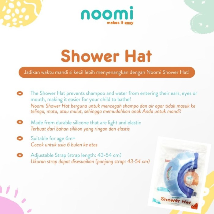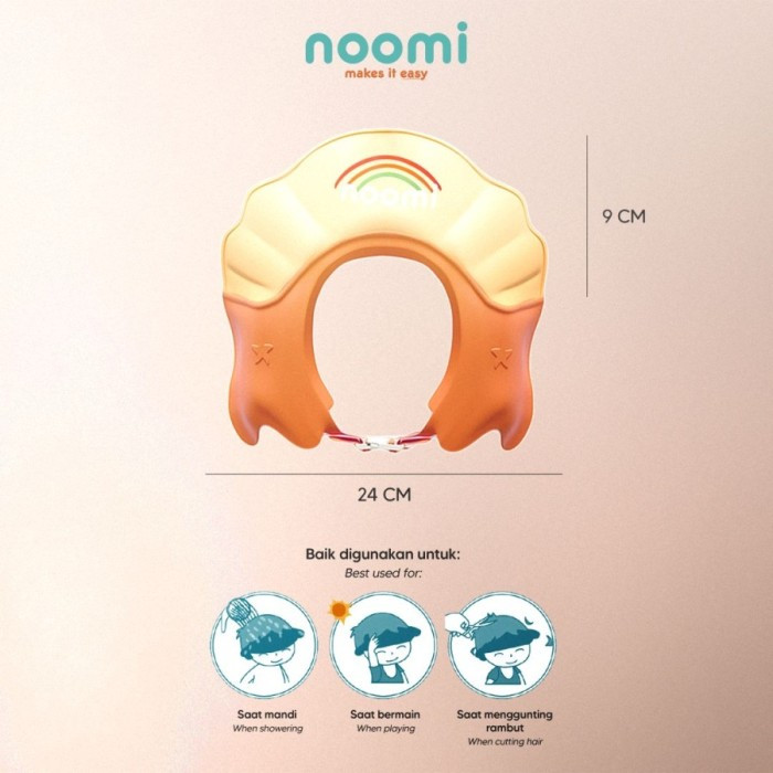 Noomi Shower Hat berguna untuk mencegah Shampoo dan air agar tidak masuk ke telinga, mata dan mulut, sehingga memudahkan anak anda untuk mandi atau beraktifitas.