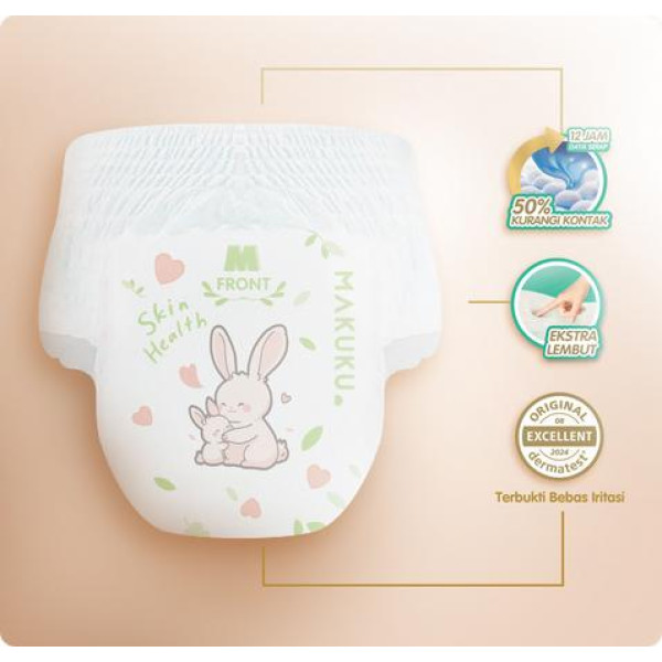 Makuku Skin Health adalah popok celana yang dirancang khusus untuk menyerap kelembapan dan mengurangi rasa tidak nyaman karena basah pada kulit bayi. Dengan bantalan timbul adaptif, mengurangi kontak dengan kulit hingga 50%. Cocok untuk menemani si Kecil hingga 12 jam. Terbukti bebas iritasi telah melalui uji dermatologis secara ketat di Jerman oleh Dermatest GmbH, sebuah lembaga independen berstandar internasional.