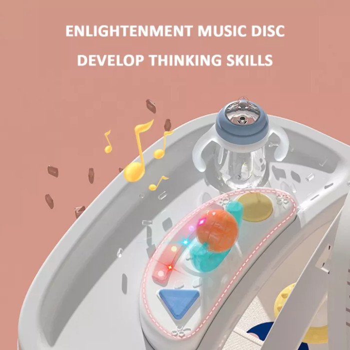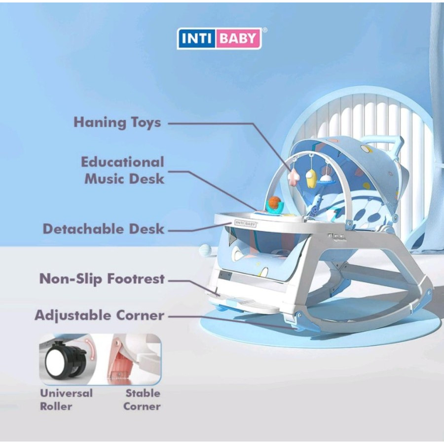 Dilengkapi meja yang dapat digunakan sebagai meja makan atau area bermain. Jarak meja dapat disesuaikan serta dapat dilepas pasang untuk memudahkan pembersihan.