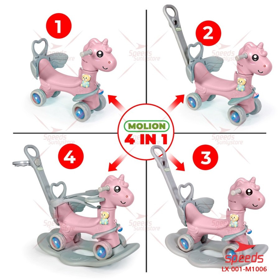 Mainan Kuda-Kudaan ini memiliki berbagai macam mode berbeda yang dapat digunakan. Mode pertama yaitu mode dorong, mode roda, dan mode goyang.