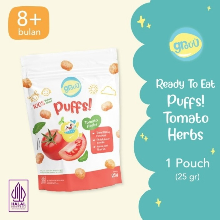 Camilan Puffs Baru dari Grouu yang terbuat dari beras dan buah pilihan serta mudah lembut di mulut sehingga aman dikonsumsi untuk si kecil yang tentunya sudah BPOM dan Halal