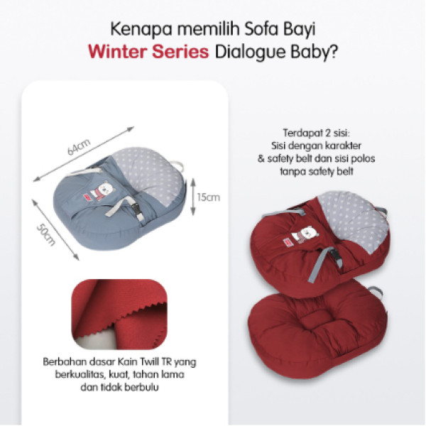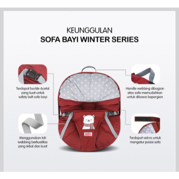 – Dapat dipakai untuk posisi bayi duduk dengan cara mengencangkan atau menarik velcro atau prepet yang terdapat disamping kiri dan kanan sofa.
