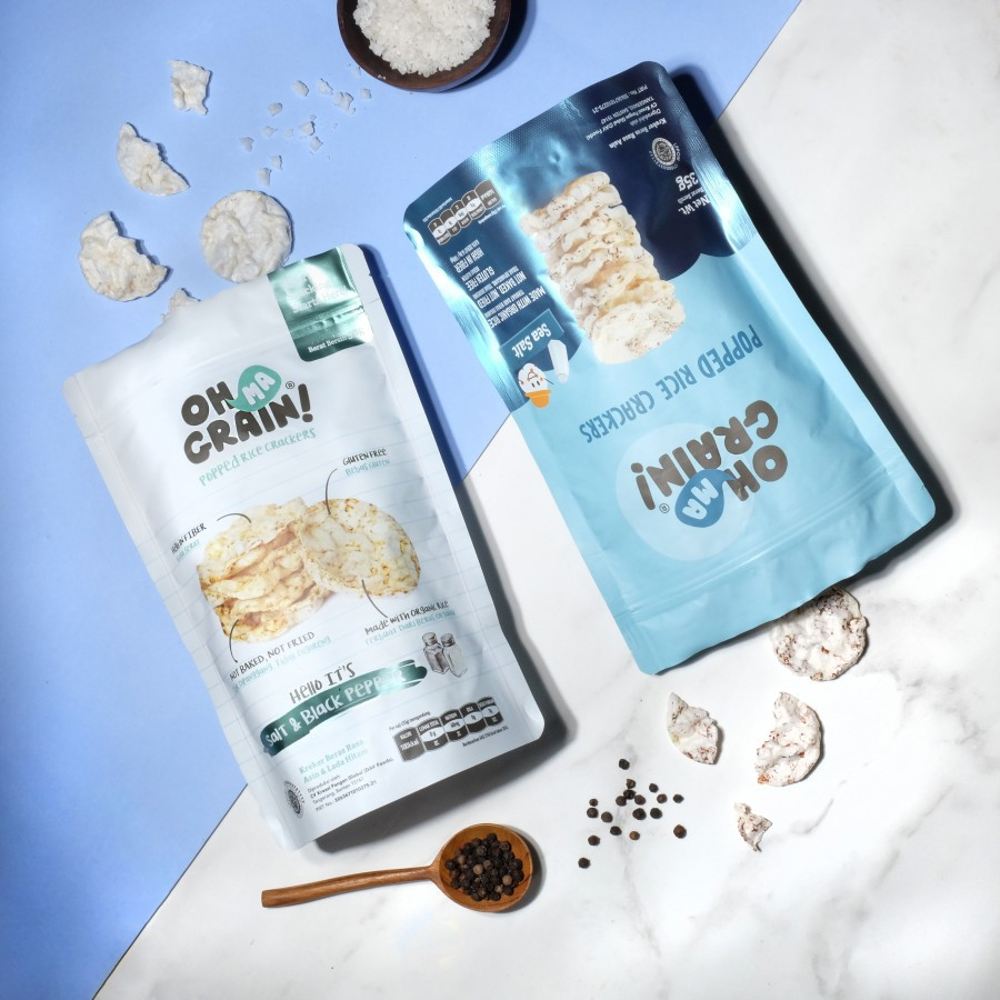 Oh Ma Grain! adalah snack beras yang terbuat dari campuran beras cokelat dan beras putih organik. Proses pembuatannya tidak dipanggang, tidak digoreng, tapi menggunakan popping technology.