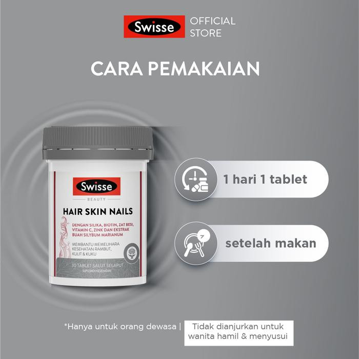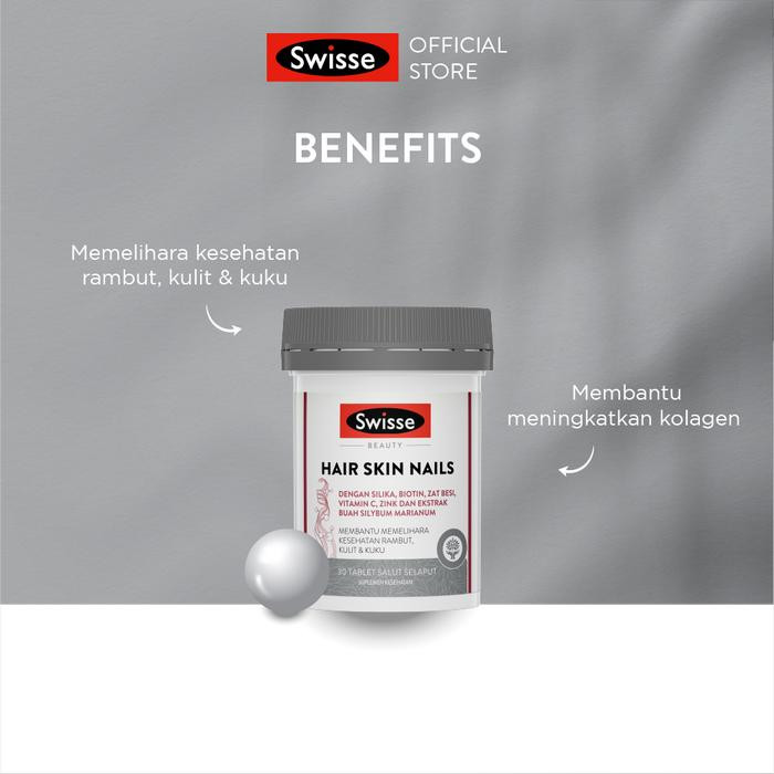 Swisse Ultiboost Hair, Skin, Nails adalah formula kecantikan premium, yang mengandung vitamin dan mineral yang dirumuskan khusus untuk mendukung produksi kolagen dan membantu dalam pemeliharaan rambut, kulit, dan kuku yang sehat.