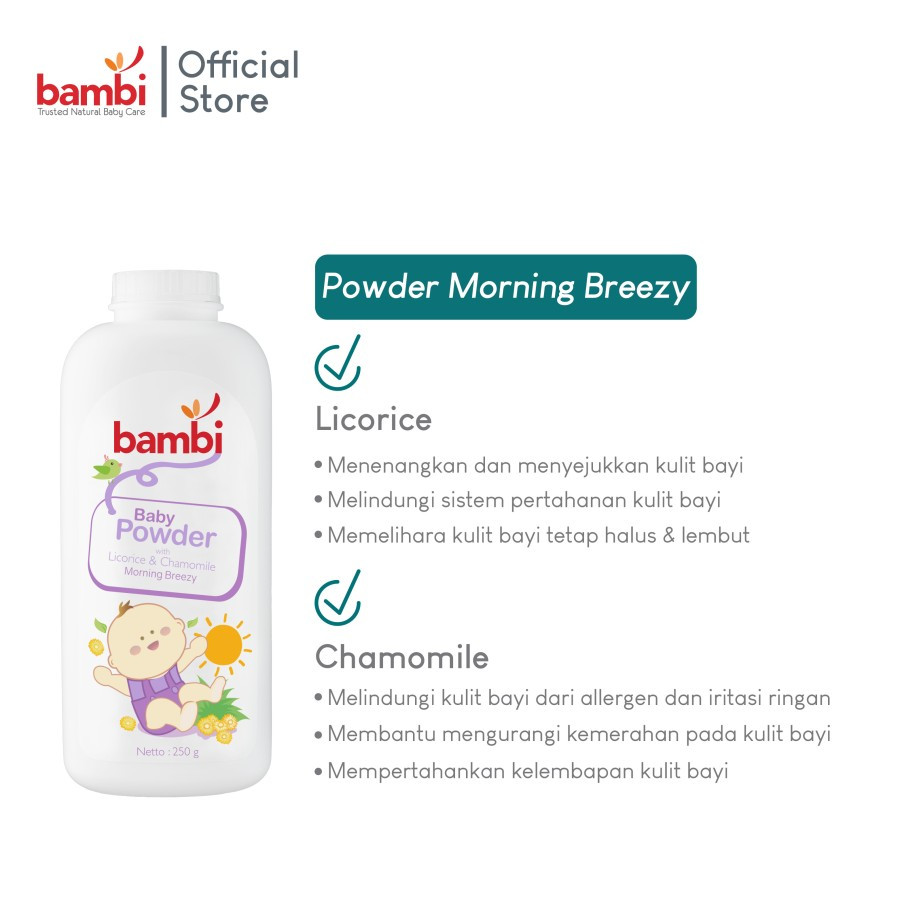 Bedak bayi yang terbuat dari talc powder, halus dan lembut dengan keharuman Morning Breezy membuat bayi merasa segar dan nyaman. Dilengkapi dengan Pro-Vitamin B5, Ekstrak Licorice & Chamomile yang melindungi kulit bayi serta menjadikan kulit bayi tetap halus dan lembut. Gunakan setelah mandi, sewaktu mengganti popok, atau berpergian.