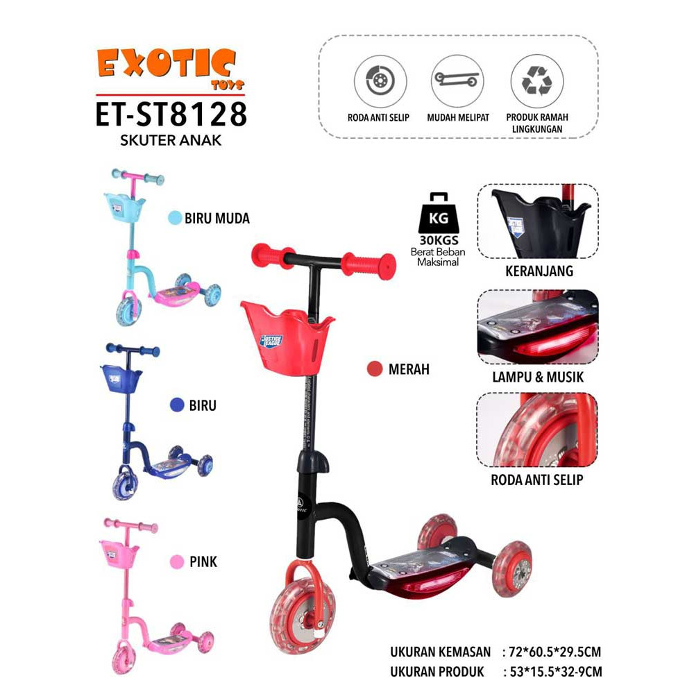 Scooter Exotic ET-ST 8128 memiliki desain dan pilihan warna yang memikat. Scooter ini juga menampilkan karaker ‘Justice League’ yang terkenal, untuk menambah keceriaan sang buah hati Anda.