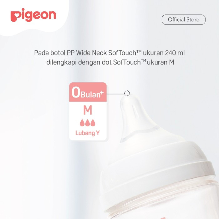 Botol bebas BPA desain lebar ukuran 160ml yang terbuat dari bahan 80%Polypropylene (PP) dan 20% Biomass Polypropyplene yang tahan suhu hingga 110°celcius dan pada botol terdapat logo Pigeon yang terbuat dari Tinta Food Contact Grade dan dilengkapi dengan Dot Softouch ukuran SS untuk bayi baru lahir (+0 bulan) dan dilengkapi dgn stiker