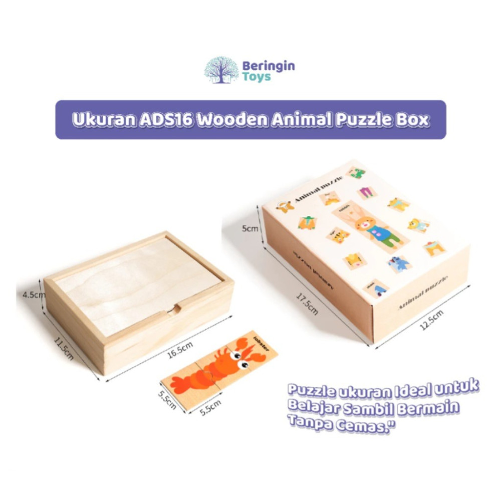 Wooden Animal Puzzle Box dirancang untuk anak-anak usia dini agar belajar mengenal hewan, warna, dan bentuk sambil bermain mencocokkan potongan puzzle yang lucu dan berwarna-warni.