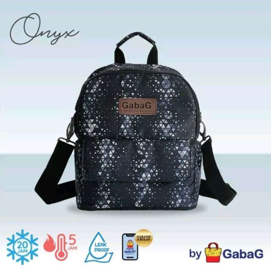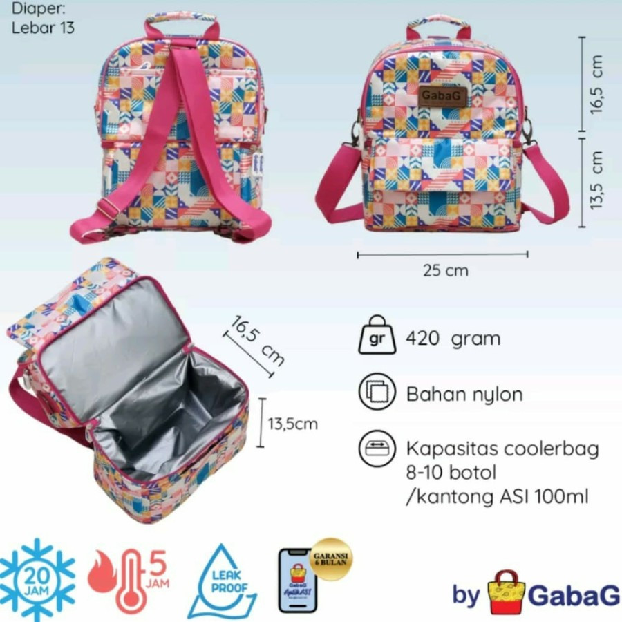 bagian cooler bag terdapat lapisan khusus thermal dari GabaG yang dapat menjaga suhu dingin hingga 20 jam, dan hangat hingga 4 jam serta anti bocor.