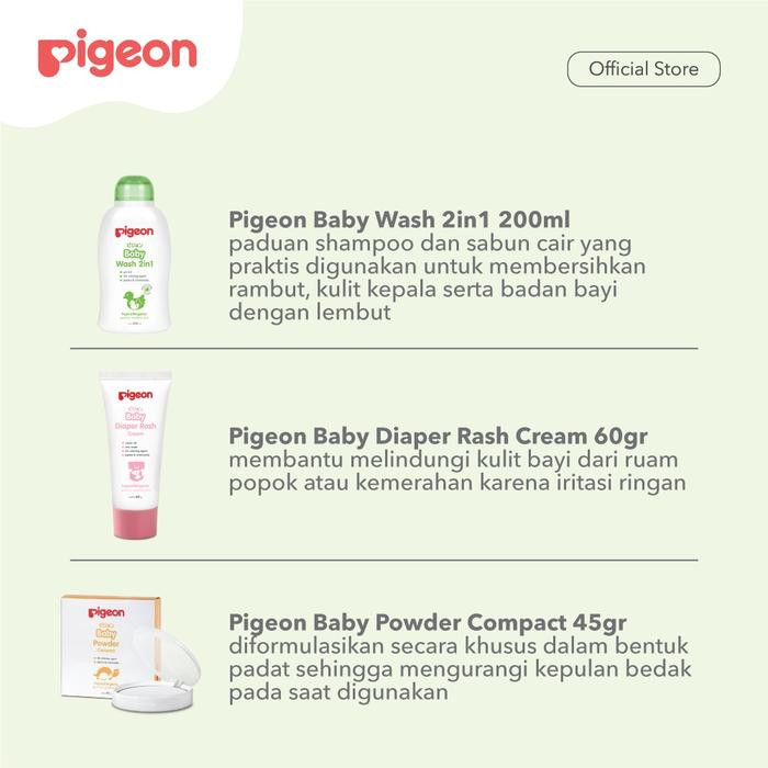 Paket perlengkapan bayi yang sangat cocok untuk hampers baby newborn (bayi baru lahir). Produk Pigeon terbuat dari mild ingredients dan sudah hypoallergenic tested, sehingga aman untuk kulit bayi baru yang lahir yang masih sensitif dan meminimalisir timbulnya alergi. Dapat digunakan untuk perawatan bayi sehari-hari