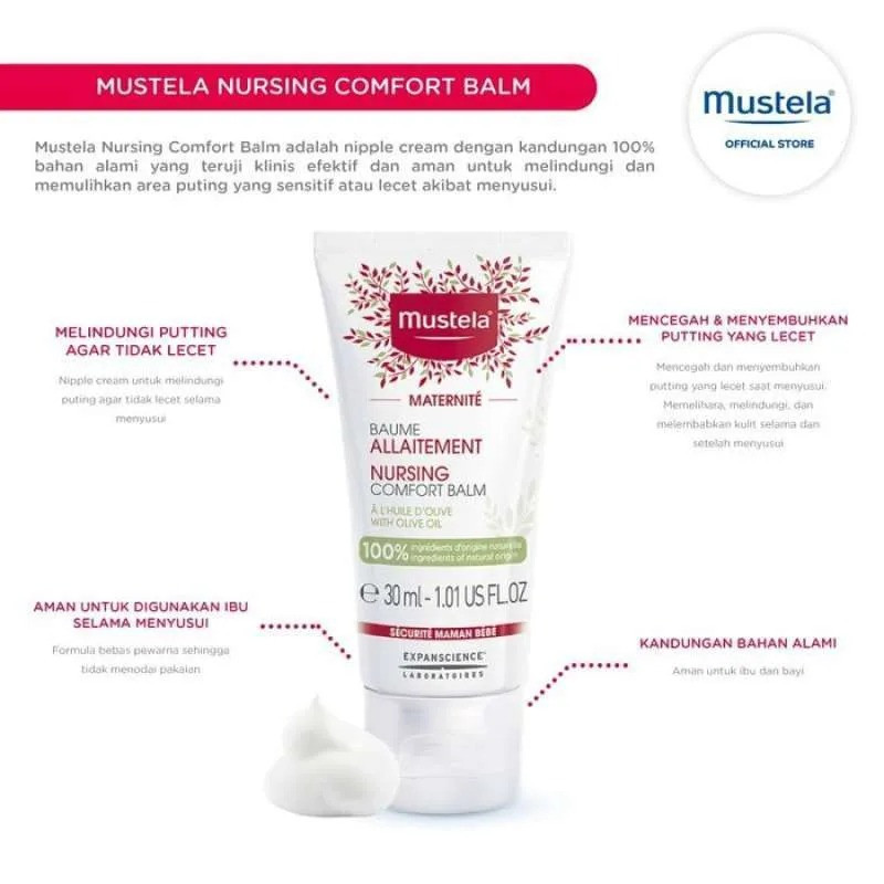Mustela Nursing Comfort Balm adalah nipple cream dengan kandungan 100% bahan alami yang teruji klinis efektif dan aman untuk melindungi dan memulihkan area puting yang sensitif atau lecet akibat menyusui.