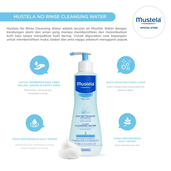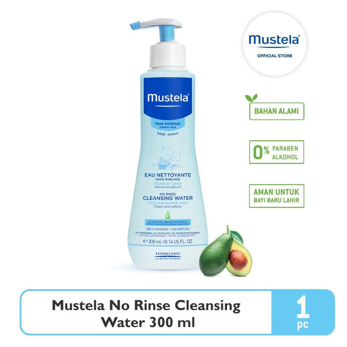 Mustela No Rinse Cleansing Water adalah larutan air Micellar Water dengan kandungan alami dan aman yang mampu membersihkan dan melembutkan kulit bayi tanpa menjadikan kulit kering. Cocok digunakan saat bepergian untuk membersihkan muka, badan dan area nappy sebelum mengganti popok.