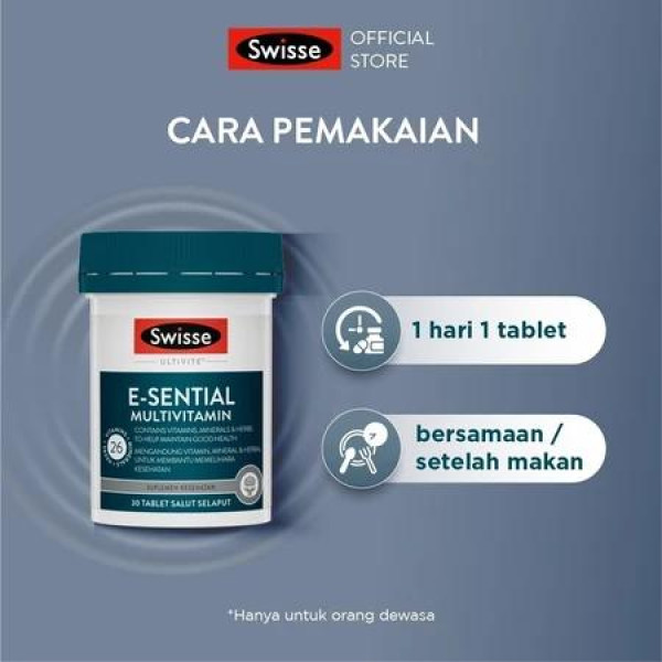 Swisse Ultivite E-Sential Multivitamin adalah formula kualitas premium yang mengandung 26 vitamin utama, mineral, antioksidan dan herbal untuk membantu produksi energi dan stamina.