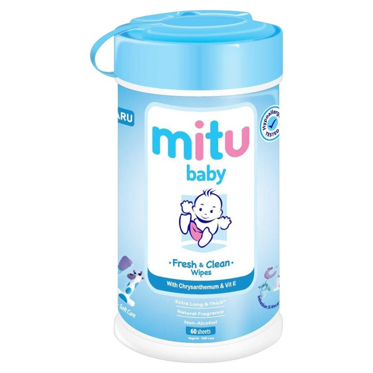 Mitu Baby Wipes Bottle - Blue [60 Sheets] merupakan tissue pembersih yang cocok untuk bayi tanpa kandungan alkohol dan praktis digunakan sebagai pengganti air, melindungi kulit dari iritasi dan memberikan keharuman menyegarkan pada bayi Anda.