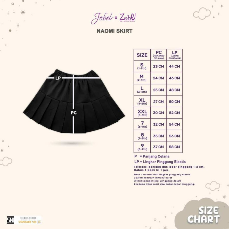 1. S (1-2 tahun), Panjang Rok = 23 cm, Lingkar Pinggang elastis sampai 44 cm.